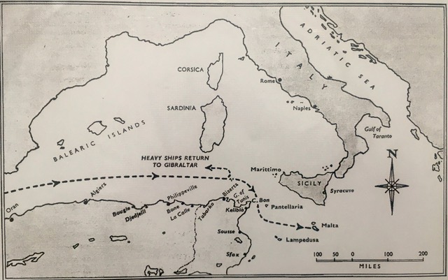 MV Brisbane Star was launched in 1937 as a twin screw refrigerated cargo liner and delivered to Cammell Laird & Co Ltd at Birkenhead for Union Cold Storage (Blue Star Line acting as managers), sailing pre-war on the main trades from the UK to Australia, New Zealand and South America. During 1942 the ownership was transferred to Frederick Leyland & Co Ltd, keeping the same managers. The ship was 549 feet ( 167 m) long with a beam of 70 feet (21 m) with a gross registered tonnage of 11,076 tons. She was fitted with two 10 cylinder Sulzer two stroke single acting diesel engines of 2806 nhp, giving a speed of over 15 knots. Many accounts have been written about this particular Malta convoy, none better than that written by Brian James Crabb in 2014, which I recommend; ‘Operation Pedestal – The Story of Convoy WS21S in August 1942’ (Shaun Tyas publishers) The author of this current article has made many references to this book, along with the official report of 16th August 1942, given to The Admiralty by the Royal Navy liaison officer who was onboard the MV Brisbane Star, at the time, Lieutenant Edward Douglas Symes. An important incident that occurred aboard the ship during the convoy is however, left out of his report. Not so, in a letter written by Captain Riley on the same day to the Blue Star Head Office in London, relating to an aborted mutiny, that was kept secret for many years, both reports I will refer to in this text. With the arrival of WW2, MV Brisbane Star, being a fast modern ship, was made good use of by the Board of Trade and Admiralty in visiting ports around the world, sometimes within a convoy but more often than not sailing as an independent. One of her first convoys was OB4 – Liverpool to Australia in September 1939, on the return route in November the radio operator of Brisbane Star picked up a distress call from the MV Doric Star which was under attack from the German pocket-battleship Graf Spee. The transmission signals were picked up by one of the Admiralty’s listening posts, who were able to track the battleship, and send three cruisers into the area. Meanwhile the battleship had forced the Doric Star to ‘heave to’ and take its crew prisoners of war, and then proceeded to scuttle it. (ironically only a short time later the Kapitan of Graf Spee scuttled his ship during The Battle of the River Plate). Knowing the Brisbane Star was nearby, the German battleship made full speed to intercept, but encountered the SS Tairoa en route, and in taking time to sink that ship, allowed the Brisbane Star to escape. For the next two years the Brisbane Star roamed the oceans on various convoys, plying trade between Australia, New Zealand, South Africa, India and South America, coming under attack on occasions but getting through mainly unscathed, bringing much needed food to the UK. The ship fitted the criteria demanded by the Admiralty for Operation Pedestal, so on the 2nd August 1942 the Brisbane Star along with her sister ship, the Melbourne Star were in the River Clyde waiting to link up with the rest of the convoy for its journey to Malta. Each of these two ships carried essential supplies, along with torpedoes, gun barrels and aviation fuel in cans on deck, a very dangerous cargo for a dangerous journey. I will now give the events surrounding the passage of MV Brisbane Star on this convoy, the reader can consult the reference work previously mentioned for the full story of Operation Pedestal, if required. Looking at the map it will be seen that once through the Straits of Gibraltar, the convoy entered the Mediterranean Sea, then having to pass through the Straits of Sicily with Tunisia one side and Sicily on the other, until with luck, Malta was finally reached.