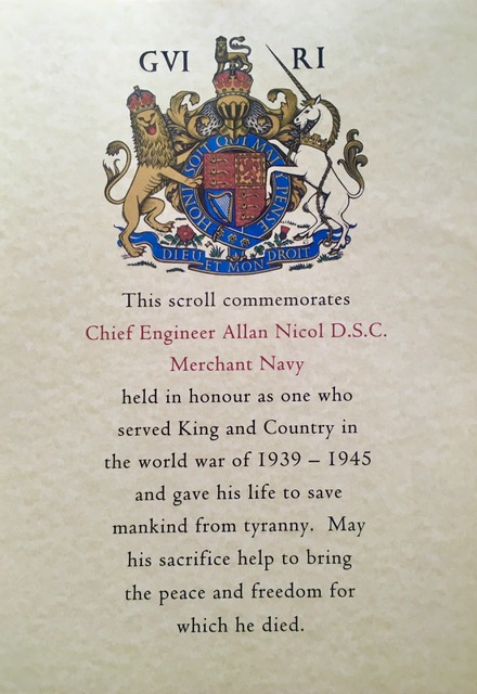 As can be seen in this photograph Allan Nicol took his wife Lilian and their daughter Janet to Buckingham Palace to watch him receiving the Distinguished Service Cross from HM King George VI. The official recommendation stating:-