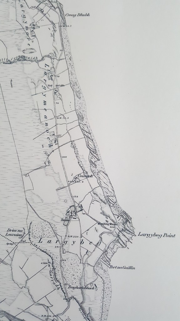 It was indeed at Largie Beg that Dan Cook was living, him and his wife, and she was the brave woman too. There they would be all alone, but the wee herd lad for the two cows or maybe three or four. It is a good house, and it is standing there as before with everything else. Aye, and from the door you will look that way and there is the bay between you and the Dippen rocks to the southart, and you will look this way and there is the bay past Largie Meanach to Largie Mhor at the Black Rocks.