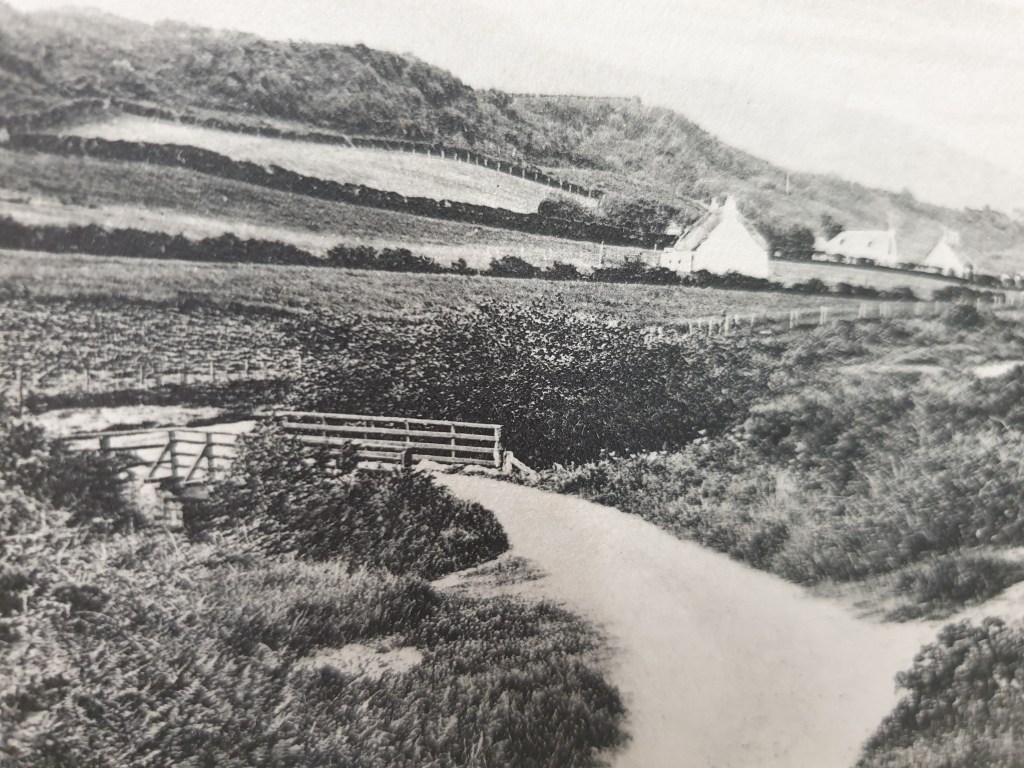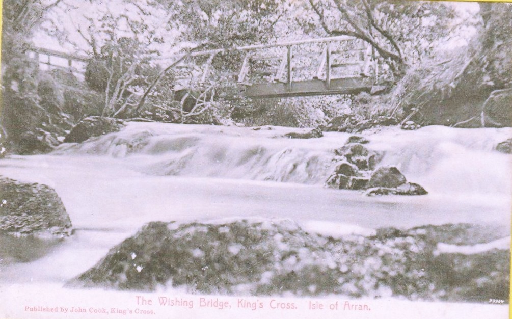 ‘The wishing bridge has a long history of use. It was the connection between the people of Kingscross and Auchincairn. The above image is from a glass plate taken by Alan Cook’s father John, Alan is remembered as the long served postmaster at Kingscross post office and shop. The image is taken before 1850 and the bridge looks much the same today.