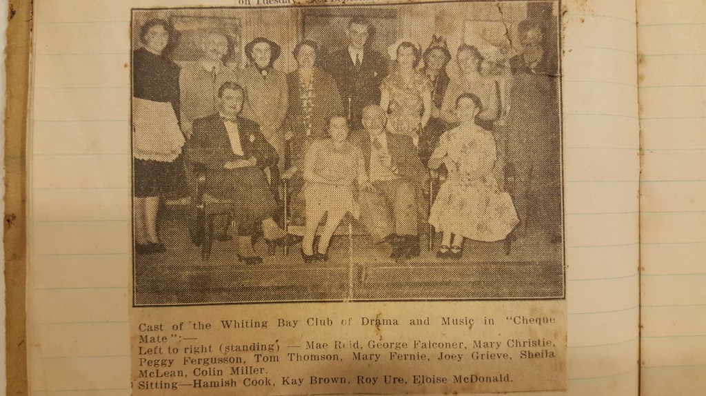 The memories group have many contributions. One of them includes a small exercise book filled with a decade of newspaper cuttings of Whiting Bay Club of Drama and Music. Each one carefuly dated and glued down by Hamish Cook.