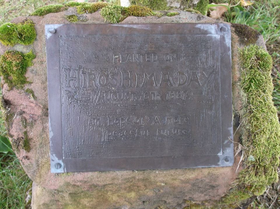 In 1987 the ornamental Rowan tree on the grass to the south side of the car park was planted on the anniversary of Hiroshima. An information plaque is next to it. Peculiarly the tree has not taken quite its normal shape, but has grown into a cloud shaped bush.