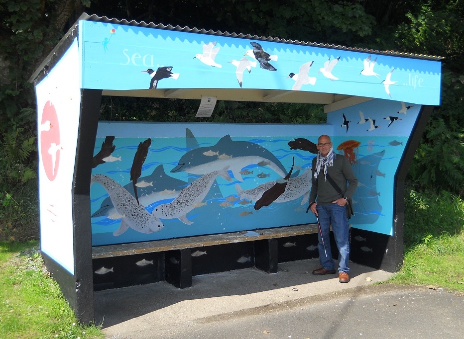 Walking up the lane to the main road is one of the village bus shelters. The art work is by David Aitcheson with some support from the community. There used to be six bus shelters built in this style, only four survive, this one, the Knockenkelly and King’s Cross road-ends ones, and the Arnhall one. They were built and paid for by, and morally belong to, the people of Whiting Bay.