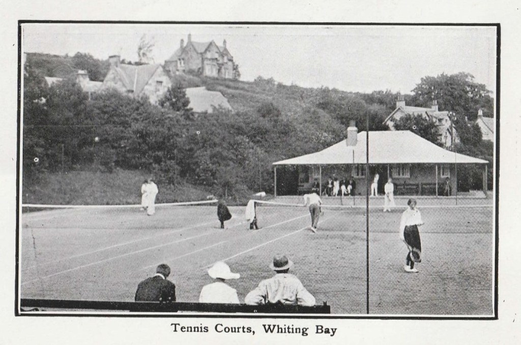 Opposite the end of the steel fence, and the start of the sea-wall, there are three roadside houses. The first and smallest used to be the tennis pavillion. The other two are built on the old tennis-courts, in front of the former Whiting Bay Hotel