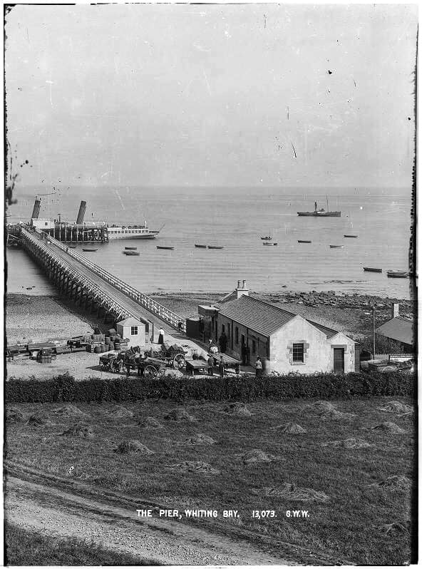 Continuing to walk along the pavement, the garage is followed by Bay Stores. Following that, the big houses called Trafalgar, Arran Brewery Guest House (which was formerly Argentine until the Falklands War when the name was changed to Traquair, later it reverted back to Argentine) Invermay, Burlington and Cameronia now the The Big Beach House. These were all built in the 1900s as boarding houses. More holiday-makers were coming to Whiting Bay with the opening of the pier in 1899.