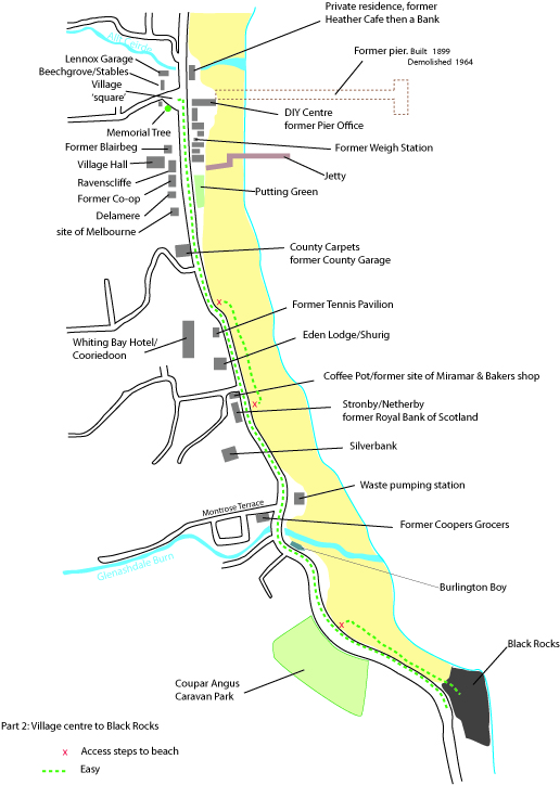 Opposite here looking over the footpath railings gives a view of the sandstone blocks below (see description in route 2 below). From here it is a short walk to the village centre. (for the additional parts described in part 2 access the beach at the jetty & head towards the former location of the pier)